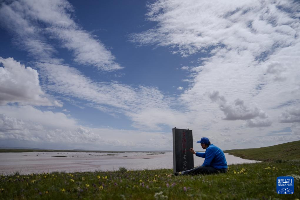 7月24日,在囊極巴隴,科考隊員在為紀(jì)念碑上的字體描紅。新華社發(fā) 杜笑微 攝