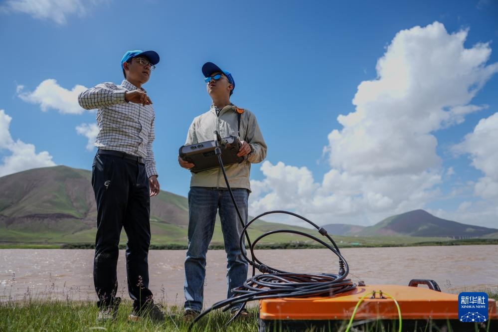 7月24日,科考隊員在通天河科欠曲進(jìn)行地下水水位測量。新華社記者 潘彬彬 攝