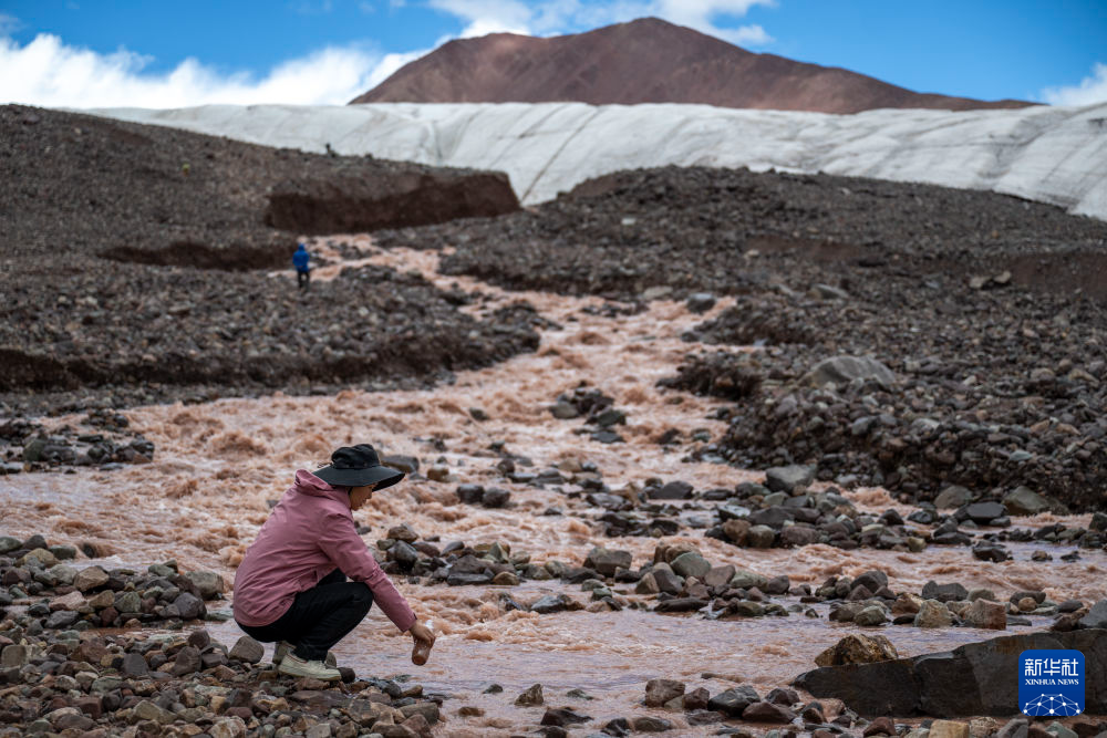 7月25日,科考隊(duì)員在冬克瑪?shù)妆ㄟM(jìn)行水樣采集工作。新華社記者 伍志尊 攝