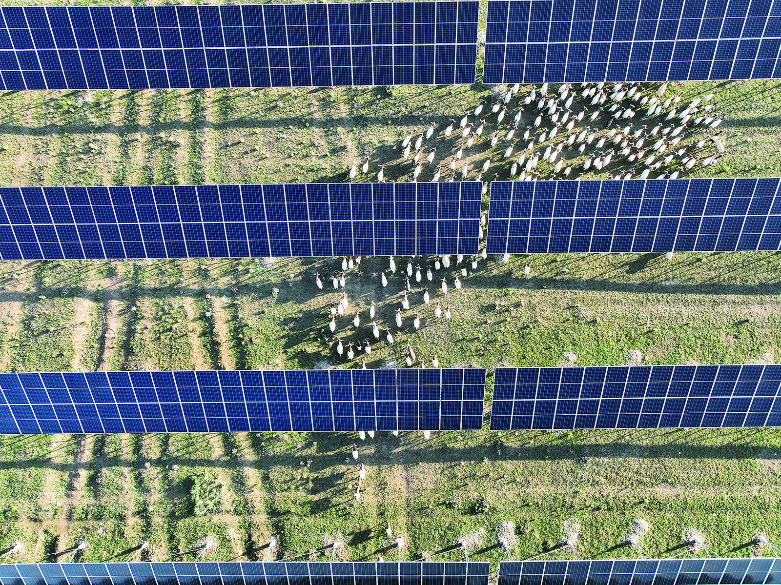 在這片藍(lán)綠交織之間,一群群“明星”或是悠閑踱步,或是低頭覓食,大伙兒為它們起了一個(gè)識(shí)別度很高的名字——“光伏羊”。