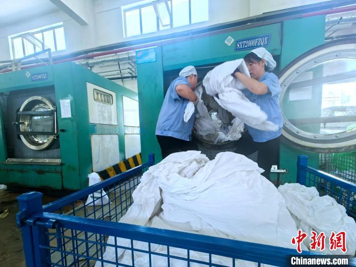 圖為洗滌工祁成莉(右)正和工友一起干活。李雋 攝