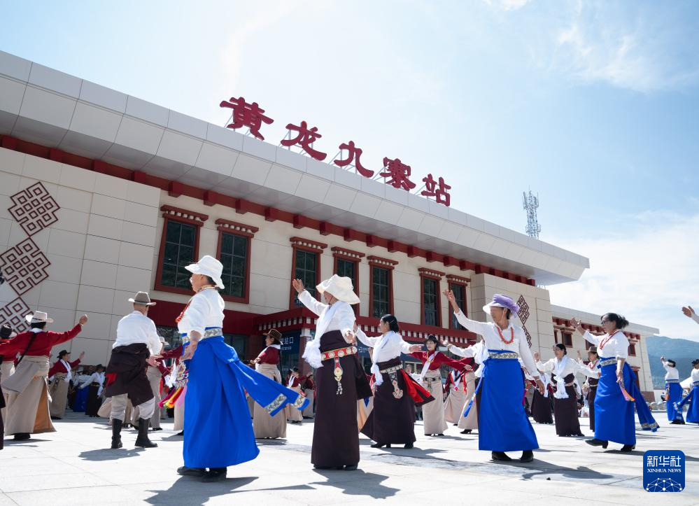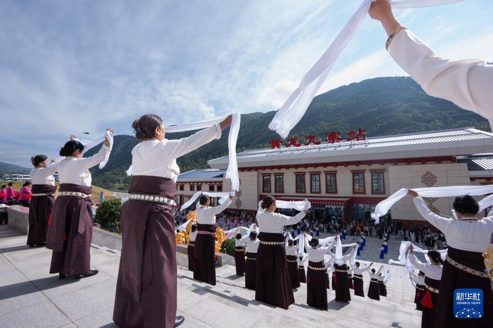 8月30日,在黃龍九寨站,當(dāng)?shù)厝罕娫诖ㄇ噼F路鎮(zhèn)江關(guān)至黃勝關(guān)段開通首發(fā)儀式上跳舞慶祝。新華社記者 江宏景 攝