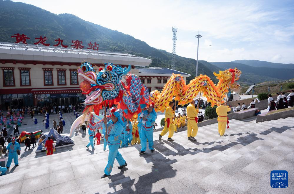 8月30日,在黃龍九寨站,當(dāng)?shù)厝罕娫诖ㄇ噼F路鎮(zhèn)江關(guān)至黃勝關(guān)段開通首發(fā)儀式上舞龍。新華社記者 江宏景 攝