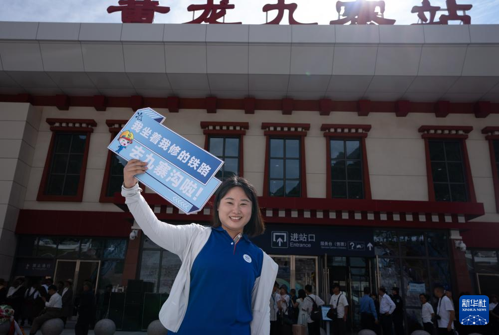 8月30日,在黃龍九寨站,當(dāng)?shù)厝罕姂c祝川青鐵路鎮(zhèn)江關(guān)至黃勝關(guān)段開通。新華社記者 江宏景 攝