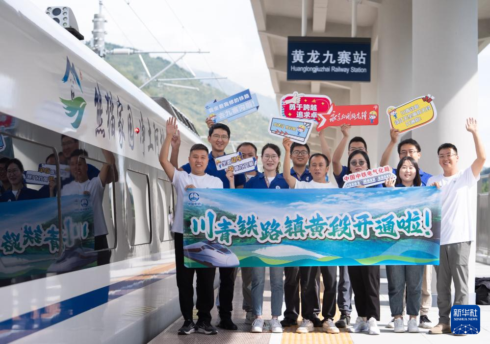 8月30日,參與川青鐵路鎮(zhèn)江關(guān)至黃勝關(guān)段修建的中國中鐵電氣化局員工在黃龍九寨站首發(fā)列車前留影。新華社記者 江宏景 攝