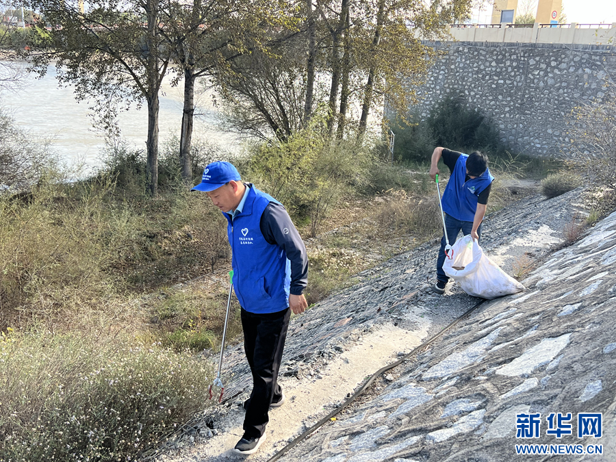 閆貴元(前)在黃河岸邊撿拾垃圾。新華網(wǎng) 魚昊 攝