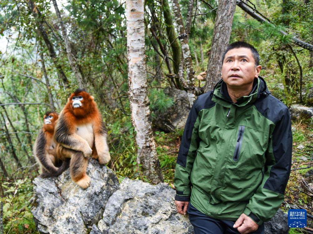 在四川白河國家級(jí)自然保護(hù)區(qū),唐玉林與川金絲猴互動(dòng)(10月11日攝)。新華社記者 王曦 攝