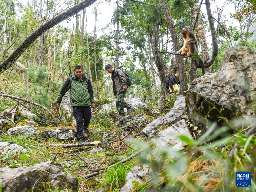 在四川白河國家級(jí)自然保護(hù)區(qū),唐玉林和川金絲猴互動(dòng)(10月11日攝)。新華社記者 王曦 攝
