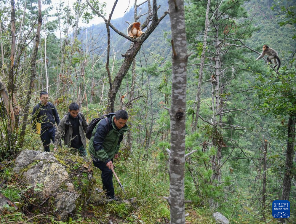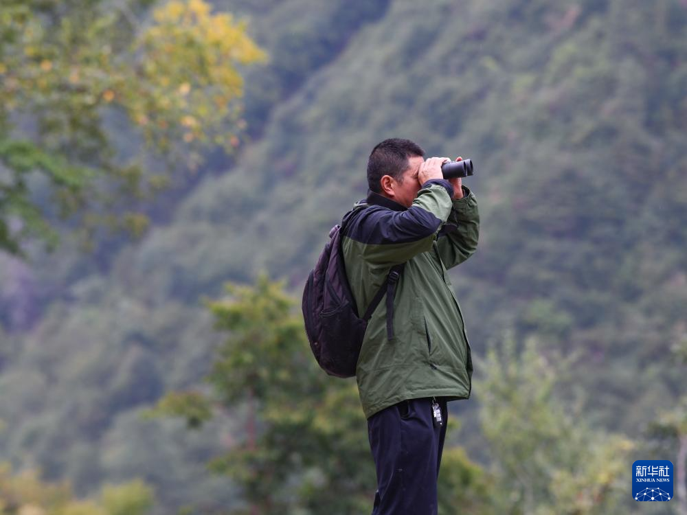 在四川白河國家級(jí)自然保護(hù)區(qū),唐玉林在觀察川金絲猴活動(dòng)(10月11日攝)。新華社記者 王曦 攝