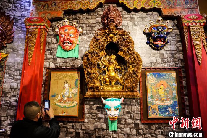 圖為參觀人員拍攝熱貢唐卡作品。中新社記者 薛蒂 攝