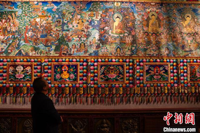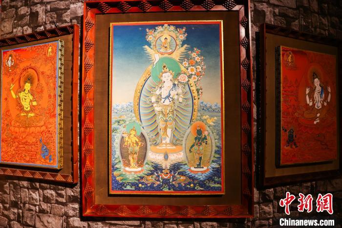 圖為畫院內(nèi)的熱貢唐卡作品。中新社記者 薛蒂 攝