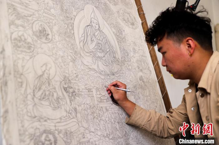 圖為畫師為唐卡打底稿。中新社記者 薛蒂 攝