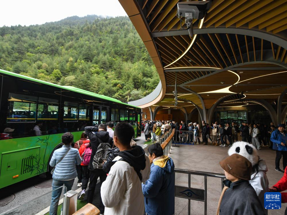 10月9日,游客在黃龍九寨站外乘坐通往景區(qū)的接駁車。新華社記者 王曦 攝