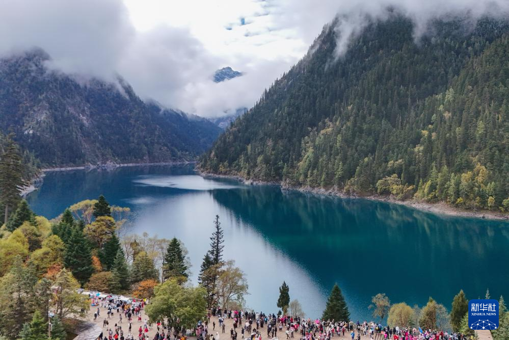 10月10日,游客在九寨溝景區(qū)長(zhǎng)海游覽觀光(無人機(jī)照片)。新華社記者 王曦 攝