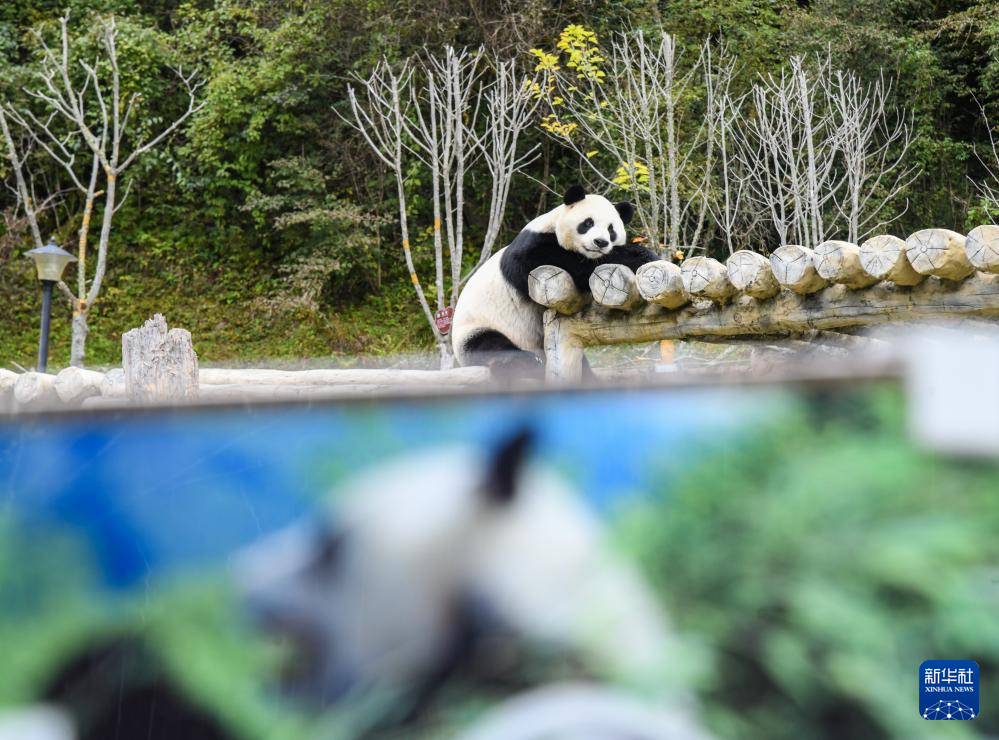 這是10月10日在九寨溝縣景區(qū)甲勿海熊貓園拍攝的大熊貓“新新”。新華社記者 王曦 攝