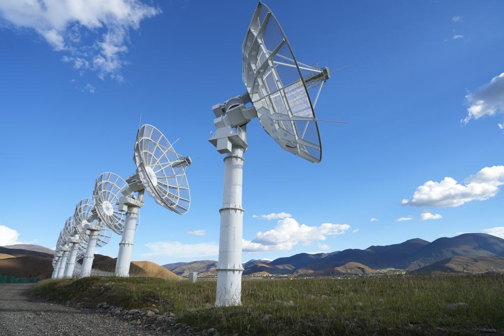 沿著227國(guó)道繼續(xù)向前,距離“拉索”50公里的稻城縣噶通鎮(zhèn),國(guó)家重大科技基礎(chǔ)設(shè)施“空間環(huán)境地基綜合監(jiān)測(cè)網(wǎng)”(子午工程二期)標(biāo)志性設(shè)備之一——圓環(huán)陣太陽(yáng)射電成像望遠(yuǎn)鏡矗立在一片開(kāi)闊的草場(chǎng)上。313臺(tái)直徑6米、形似蒲公英的天線均勻分布于直徑1公里的巨大圓環(huán)上,氣勢(shì)恢宏,當(dāng)?shù)鼐用裼H切地稱(chēng)之為 “千眼天珠”。
