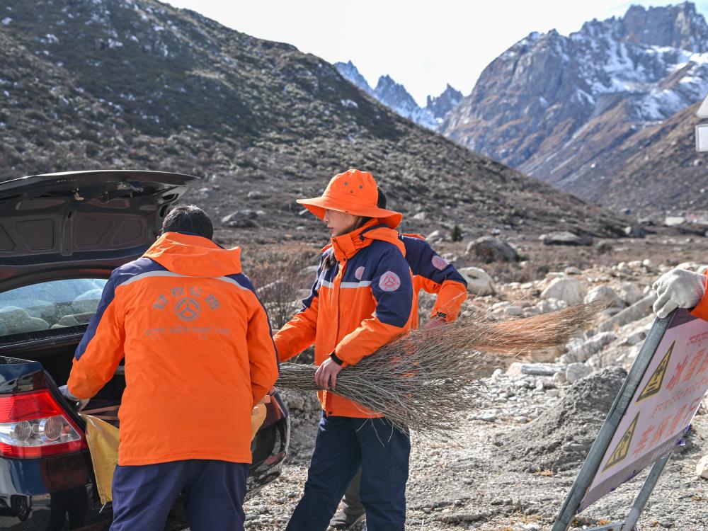 11月1日,呷瑪澤錯(右)和同事正在整理道路養(yǎng)護(hù)工具。新華社記者 王曦 攝