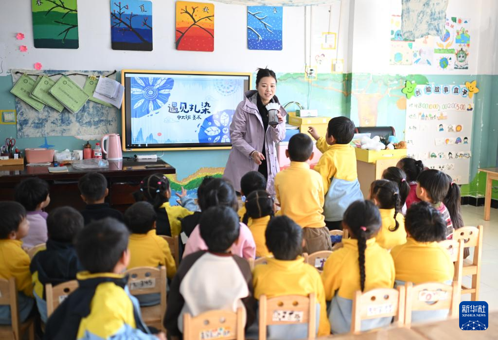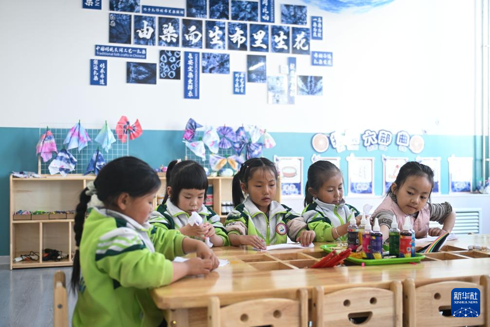 11月14日,在天峻縣民族幼兒園,小朋友學習扎染。新華社記者 李占軼 攝