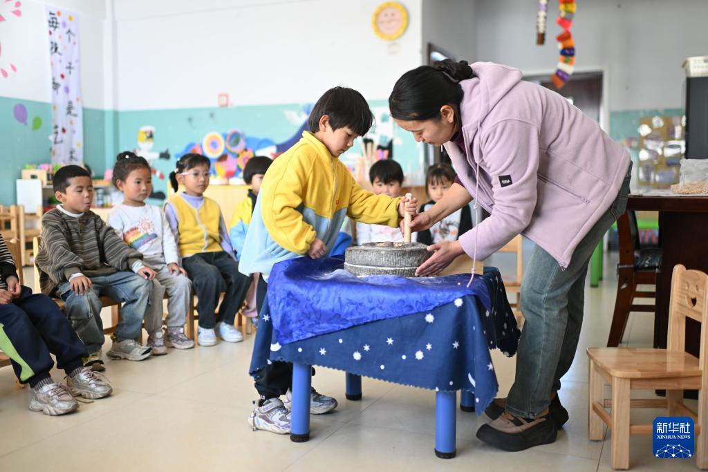 11月14日,在天峻縣民族幼兒園,小朋友們在老師帶領下上勞動課。新華社記者 張龍 攝