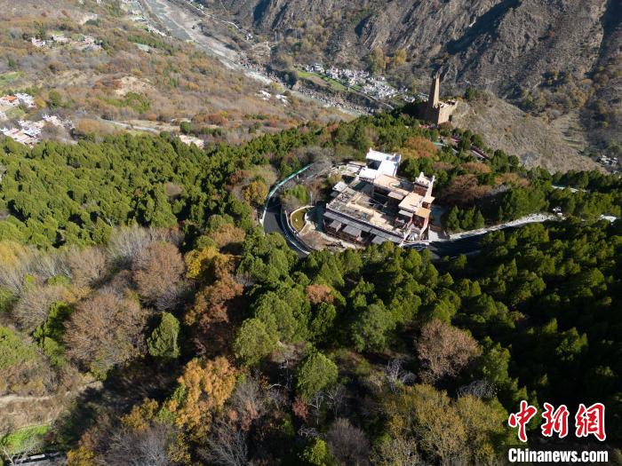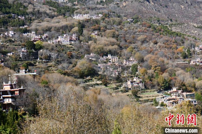 12月3日,四川省甘孜州丹巴縣,俯瞰甲居藏寨全貌。初冬時節(jié),甲居藏寨一幢幢藏式樓房在藍天白云映襯下,呈現(xiàn)出一幅色彩斑斕的景象。(無人機照片)中新社記者 張浪 攝
