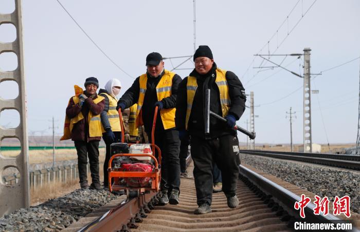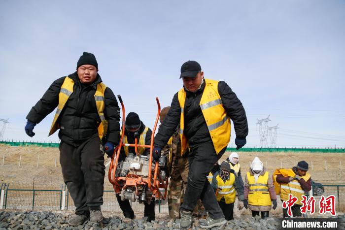 1月22日,北方小年,中國鐵路青藏集團有限公司德令哈工務(wù)段關(guān)角隧道工區(qū)“00后”職工郝斌(中),在天窗作業(yè)(為鐵路維修養(yǎng)護,施工預(yù)留的時間段)過程中用力將壓機甩入鐵路鋼軌底部,整治線路凍害。郝斌所在的工區(qū)位于青海省海西蒙古族藏族自治州天峻縣境內(nèi)的新關(guān)角隧道,平均海拔3600米,是青藏鐵路的“咽喉要道”,也是世界高海拔鐵路第一長隧。乙巳蛇年春節(jié),郝斌和他的11名同事將堅守崗位,守護“天路”。“雖然無法和家人團聚,但想到旅客能從我工作的線路上平安回家,我就感到自豪,工作也更有干勁?!焙卤笳f,這是他在工區(qū)度過的第二個春節(jié)。中新社記者 馬銘言 攝