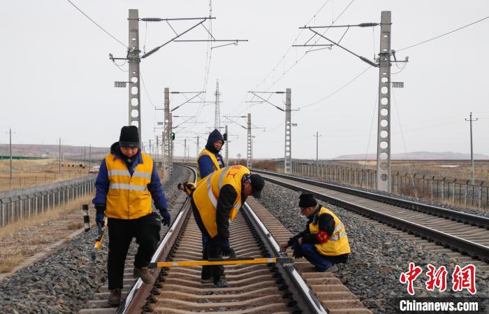 1月22日,北方小年,中國鐵路青藏集團有限公司德令哈工務(wù)段關(guān)角隧道工區(qū)“00后”職工郝斌(中),在天窗作業(yè)(為鐵路維修養(yǎng)護,施工預(yù)留的時間段)過程中使用電子道尺測量鋼軌幾何尺寸。中新社記者 馬銘言 攝