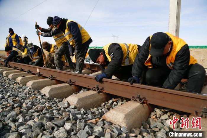 1月22日,北方小年,中國鐵路青藏集團有限公司德令哈工務(wù)段關(guān)角隧道工區(qū)“00后”職工郝斌(右一)、趙鵬舉(右二),在天窗作業(yè)(為鐵路維修養(yǎng)護,施工預(yù)留的時間段)過程中將厚度不一的墊板安裝到鋼軌底部,整治線路凍害。中新社記者 馬銘言 攝