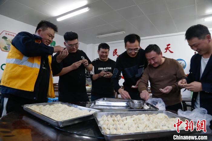 1月22日,中國北方小年,青藏集團公司德令哈工務(wù)段關(guān)角隧道工區(qū)“00后”職工郝斌(左二)、趙鵬舉(左一)和工友們包餃子。中新社記者 馬銘言 攝