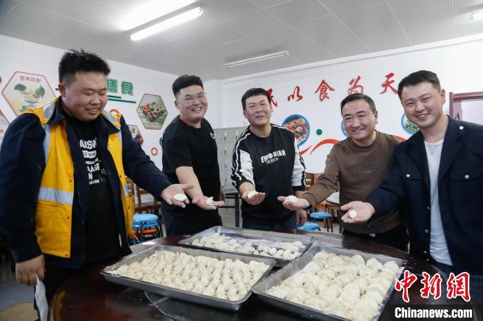 1月22日,中國北方小年,青藏集團公司德令哈工務(wù)段關(guān)角隧道工區(qū)“00后”職工郝斌(左二)、趙鵬舉(左一)和工友們展示包好的餃子。中新社記者 馬銘言 攝