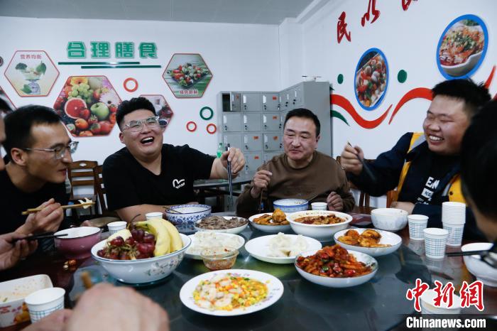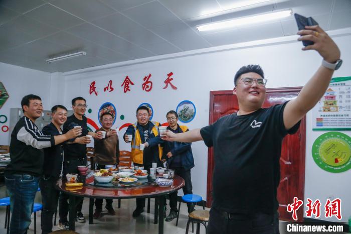 中國北方小年,青藏集團公司德令哈工務(wù)段關(guān)角隧道工區(qū)“00后”職工郝斌(左二)、趙鵬舉(右一)和工友們開心度過小年夜。中新社記者 馬銘言 攝
