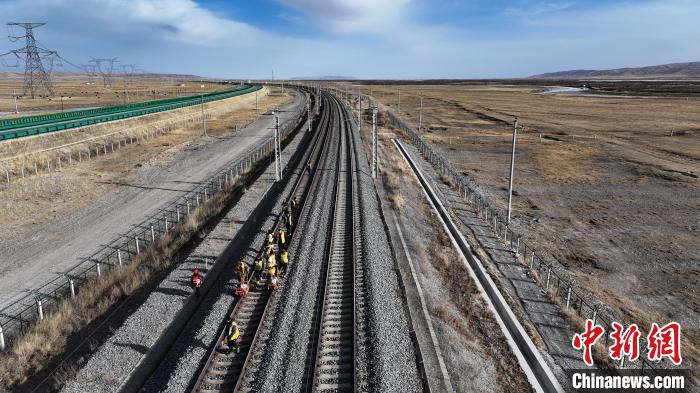 1月22日,北方小年,中國鐵路青藏集團有限公司德令哈工務(wù)段關(guān)角隧道工區(qū)職工在天窗作業(yè)(為鐵路維修養(yǎng)護,施工預(yù)留的時間段)過程中整治線路凍害。(無人機照片)中新社記者 馬銘言 攝