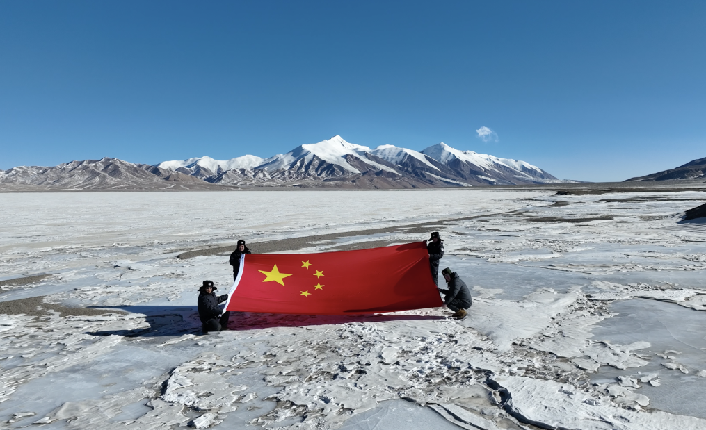 巡山隊(duì)員在可可西里無(wú)人區(qū)腹地的太陽(yáng)湖湖邊,展開(kāi)一面五星紅旗,這面國(guó)旗曾于2021年10月2日在天安門(mén)廣場(chǎng)升起。(攝于2025年1月14日)新華社發(fā)