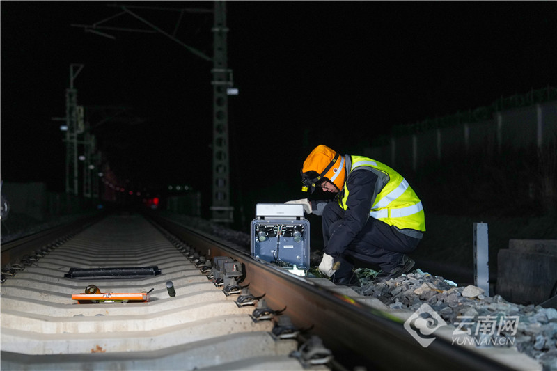 23時,趙麗程和工友們到達作業(yè)點,他們分工合作,開始對設(shè)備進行機械參數(shù)測定、測溫探頭定標、電流信號傳輸試驗等工作。寂靜的股道上,他們彎腰、下蹲、匍匐,盡量讓視線與鋼軌平齊保證機械參數(shù)測量精度,點點頭燈在軌道間不停晃動,操作工具發(fā)出的“叮當”聲格外響亮。