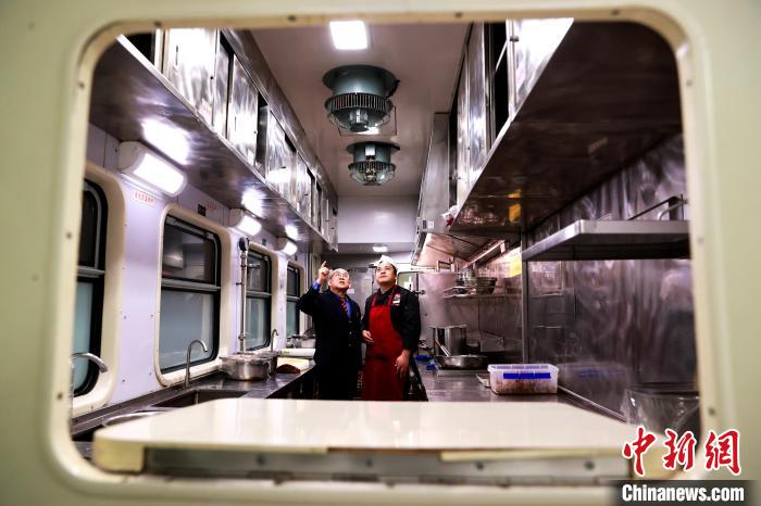 圖為郝寶君和餐車工作人員查看餐車設備運行情況。薛蒂 攝