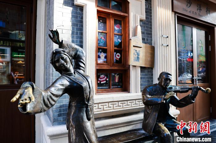 2024年12月24日,四川康定,康定情歌文化中心門口的仁欽拉姆(左)與金路易雕像。中新社記者 薛蒂 攝