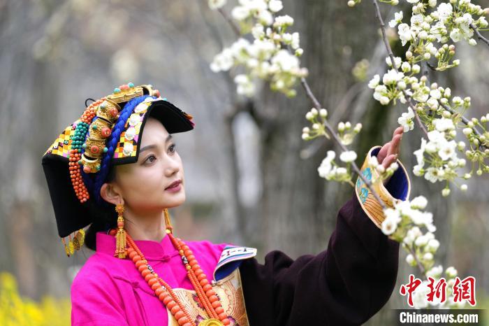 圖為藏族姑娘在梨樹下拍照。中新社記者 安源 攝