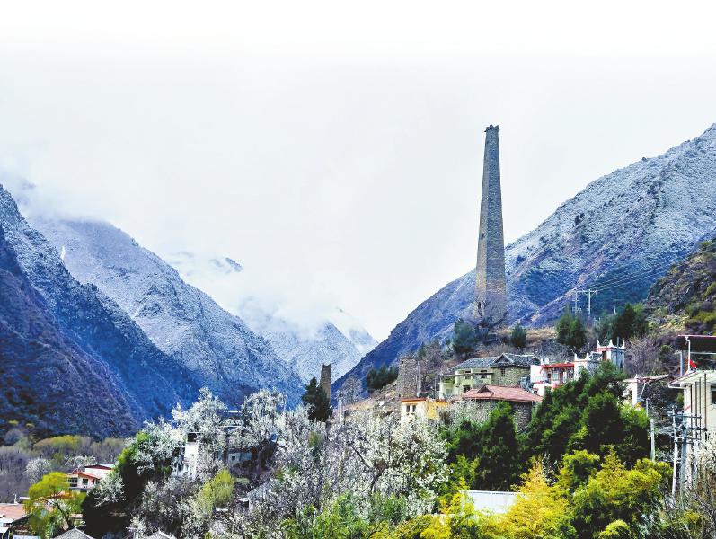 大金川河谷盛開的梨花與雪景、碉樓交織成一幅美麗的畫卷。代永清 攝