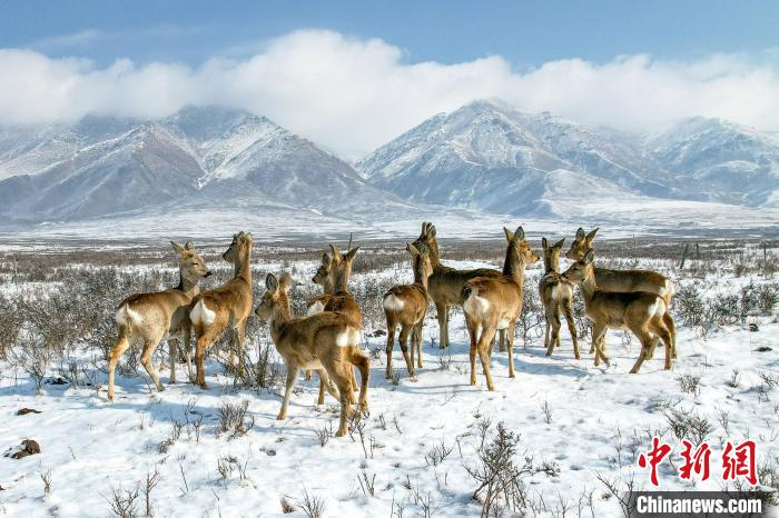 2025年2月中下旬,雪后初霽的祁連山東段武威天祝馬牙雪山下,野生保護(hù)動(dòng)物狍鹿和馬鹿在雪地中撒歡。王守輝 攝