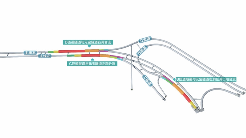 最大的挑戰(zhàn)之一是隧道交疊。在元寶樞紐地下互通中,B匝道隧道與主線元寶隧道左右洞上下交叉,共有三個交叉影響段落,分別是95米、70米、50米,上下隧道垂直高差最短處僅為33厘米,相當于上下兩條隧道幾乎緊緊挨在一起,而兩條隧道總開挖高度又接近21米,相當于7層樓高?!霸谒淼郎显傩匏淼溃杂胁簧骶涂赡芤l(fā)垮塌等事故。”廖志宣說,交疊隧道的部分還未施工,因為項目是世界之最,可供參考的案例很少,目前正和科研團隊一起,研究系統(tǒng)化的技術(shù)解決方案,為山區(qū)大型地下互通建設(shè)探路。
