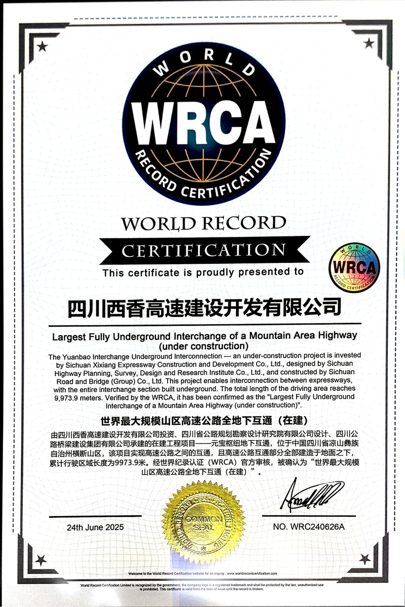 日前,西香高速公路元寶樞紐地下互通,被WRCA(世界紀錄認證公司/機構(gòu))認證為“世界最大規(guī)模山區(qū)高速公路全地下互通(在建)”。WRCA是全球包括中國唯一獲批相關(guān)世界紀錄認證商標的機構(gòu)。