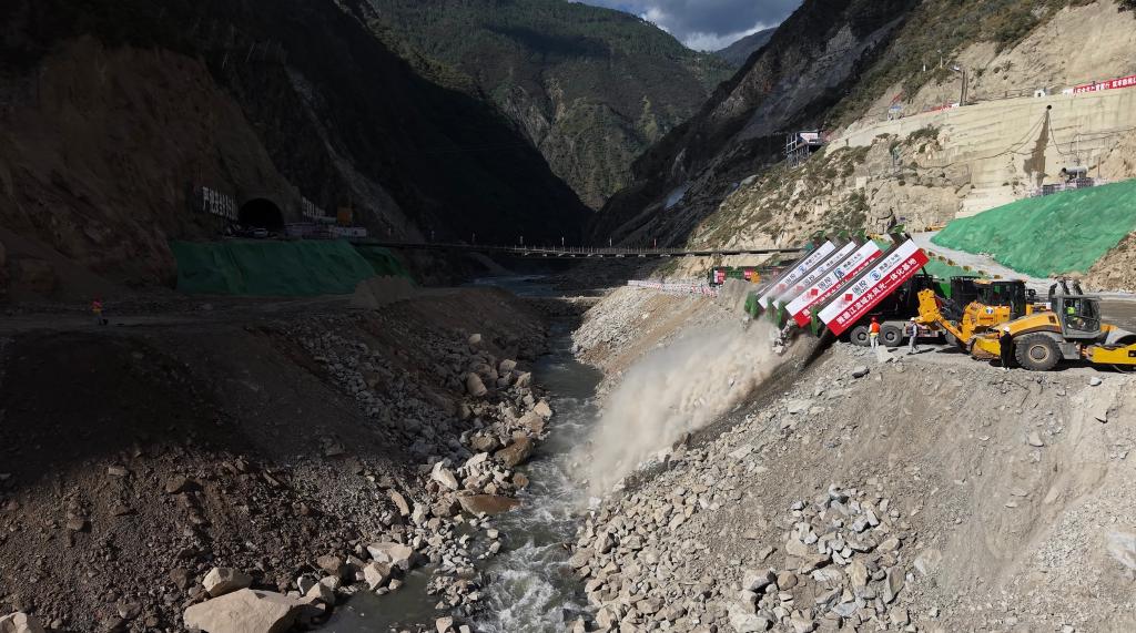 10月28日,自卸卡車將石料傾倒入孟底溝水電站龍口位置。(雅礱江流域水電開發(fā)有限公司供圖)