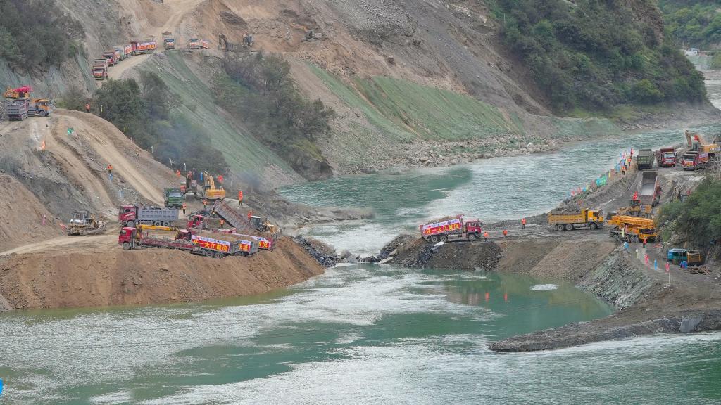 10月28日,自卸卡車協(xié)同作業(yè)將成噸石料拋投進(jìn)牙根一級(jí)水電站主龍口位置。(雅礱江流域水電開發(fā)有限公司供圖)