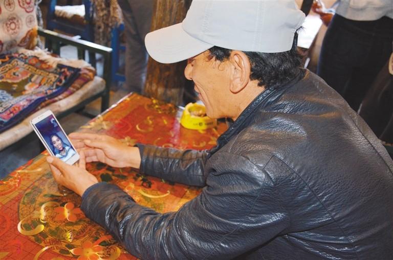 圖為山南市乃東區(qū)扎西妥門社區(qū)群眾洛桑正在社區(qū)茶館里通過手機無線網(wǎng)絡(luò)與在江蘇上學(xué)的女兒視頻通話。記者 劉楓 攝