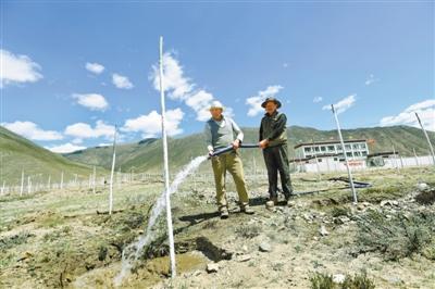 圖為近日,拉薩市墨竹工卡縣唐加鄉(xiāng)沖尼村村民在為新栽種的樹苗澆水。唐斌 攝