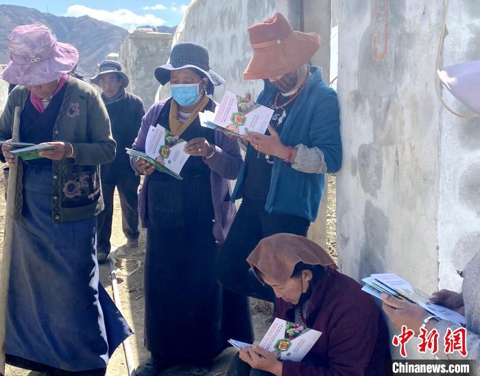 基層菜農(nóng)閱讀西藏自治區(qū)農(nóng)牧科學(xué)院蔬菜研究所技術(shù)人員免費(fèi)發(fā)放的蔬菜種植技術(shù)手冊(cè)。西藏自治區(qū)農(nóng)牧科學(xué)院蔬菜研究所供圖