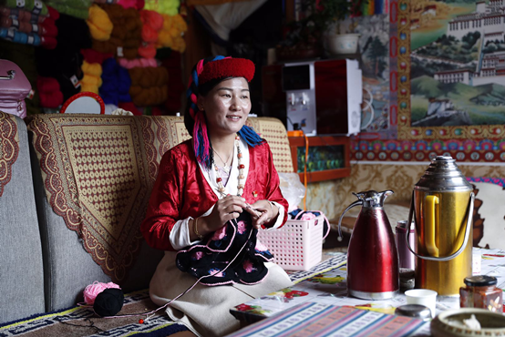 照應(yīng)客人的閑暇,卓瑪做一些毛線手工編織。新華網(wǎng) 焦鵬 攝
