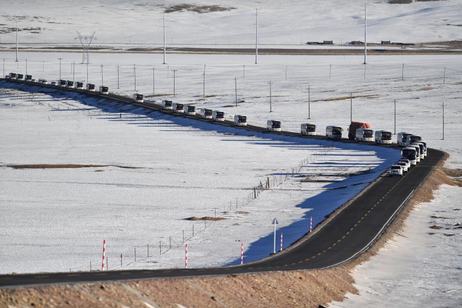 告別平均海拔5000米家鄉(xiāng)的雙湖縣牧民們乘車搬遷至海拔相對較低的藏南雅魯藏布江南岸的貢嘎縣境內(2019年12月23日攝)。新華社記者 覺果 攝