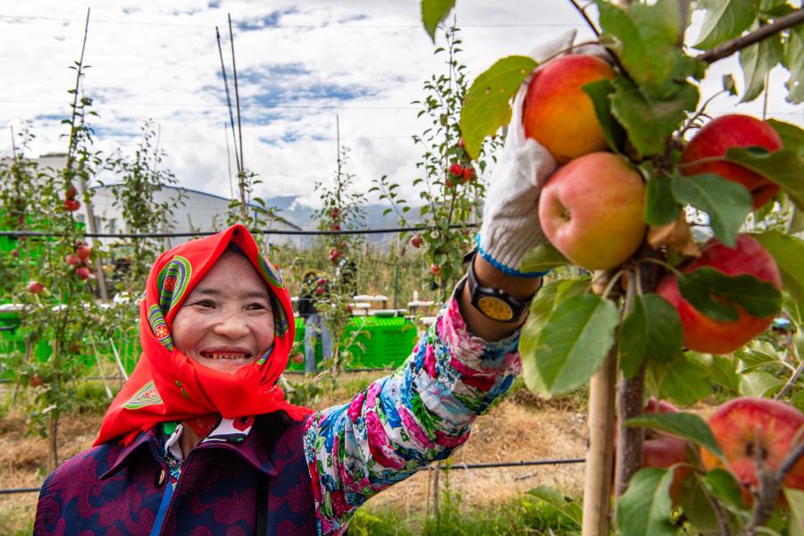 來自雙湖縣措折強瑪鄉(xiāng)才瑪榮村的搬遷群眾嘎瑪在山南市貢嘎縣森布日搬遷安置點的蘋果園內采摘蘋果(2020年9月23日攝)。新華社記者 孫非 攝
