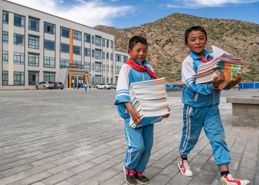 在森布日幸福家園九年一貫制學校,剛開學的學生們在搬新書(2020年8月24日攝)。這個學校坐落在山南市貢嘎縣森布日搬遷安置點旁,從高海拔地區(qū)搬遷至此的孩子們可以就近入學。新華社記者 孫非 攝