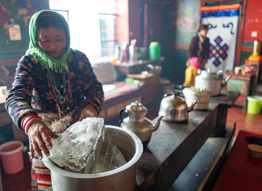 西藏雙湖縣嘎措鄉(xiāng)的牧民在化冰燒水(2019年1月31日攝)。新華社記者 普布扎西 攝